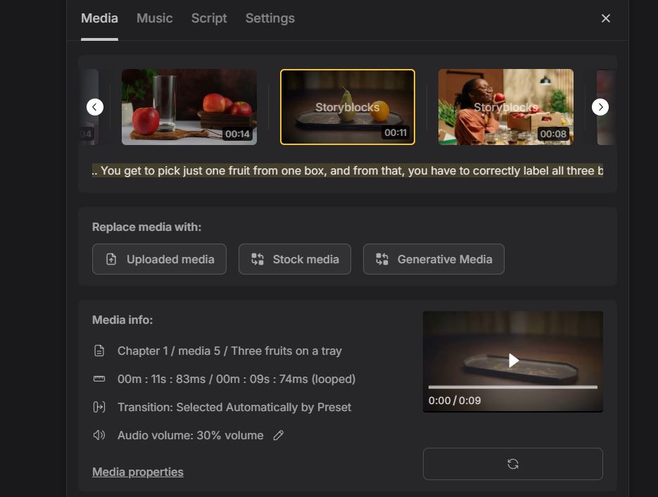 You can also change the music and make changes to various parts of the video. That is particularly great for people who are worried about copyright strikes and want to simply use safe music and video footage. For instance, in my video, I didn’t like to use stock footage. So for a small part of it, I used AI to come up with a new video.