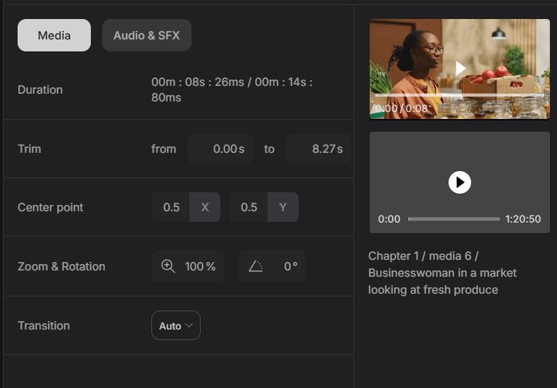 For each video, you can change center point, zoom & rotation, transition, and other settings. It is also possible to change speaker and speed. This tool can be quite a lifesaver for people who want to create a bunch of viral shorts or videos without using Adobe Premiere.