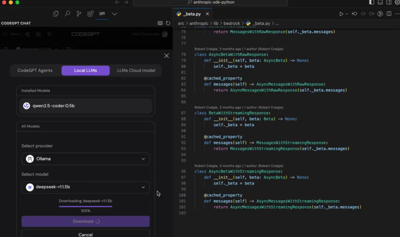 You will first have to install CodeGPT to get started. It is available as an extension for Visual Studio Code and JetBrains IDEs. You are also going to need Ollama. Once there, you just have to open the extension to start installing models.