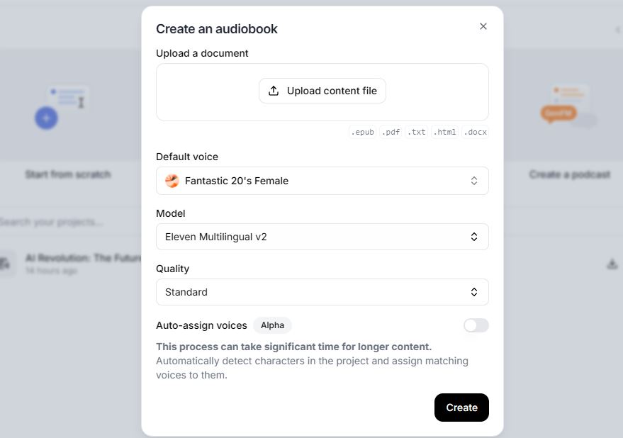 ElevenLabs is one our favorite tools. It not only has a lot of realistic voices, it has various tools that make it easier to bring your content to life. With Studio, you can create content from scratch or make podcasts and audiobooks from your files. You can upload PDF, TXT, EPUB, HTML, and Word document files to get started. You can also choose your default voice and model.