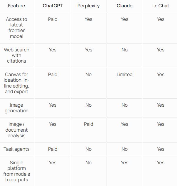 Thanks to the multimodal Pixtral Large, Le Chat can now understand images and documents a lot better. The above table compares how Le Chat stacks up against Claude, ChatGPT, and Perplexity. The Canvas feature is exciting as you can use it to collaborate with AI for serious analysis and coding. You can use Le Chat agents to automate your workflow. All these features are currently offered as free beta offerings.
