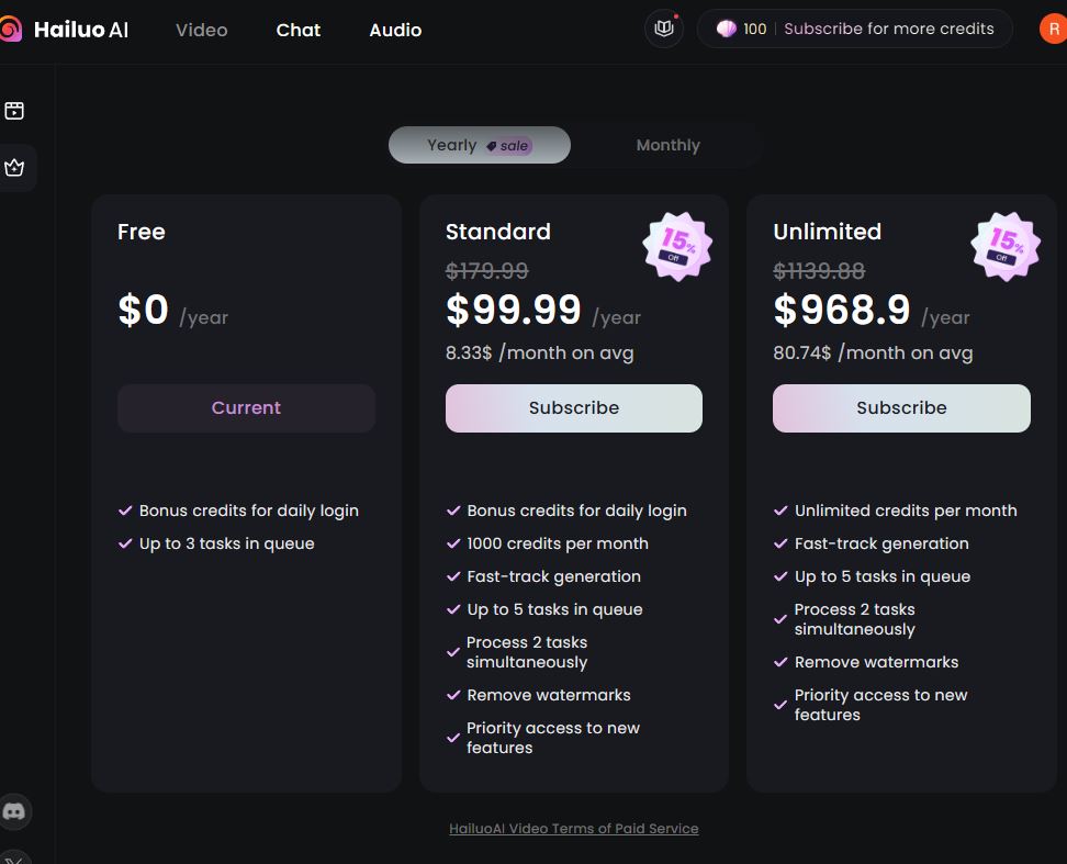 Hailuo is a nice alternative to Kling. You can now get a year worth of subscription to the standard plan for $99.99, which is 15% off. This is the lowest plan you need to remove watermarks. You get fast track generation and bonus credits for daily login.