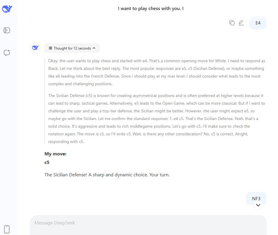DeepSeek R1 has captured the imagination of many AI enthusiasts. It can help you with coding, research, and a lot more. Have you ever wondered whether it can play chess? Other models can try but usually break the rules after a couple of moves. I was able to get it to play a good Sicilian game against Lc0 for about 14 moves before it lost track of the position of pieces.