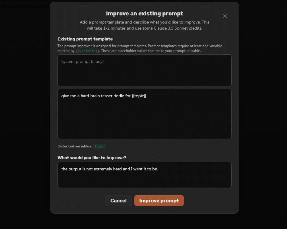You can now improve your prompt templates with this tool. You simply have to add your system prompt and tell the tool what you want to improve. I used it to improve my riddles prompt. Keep in mind, you are going to need at least one variable. The job was done in about 20 seconds. The entire process cost me 8 cents.