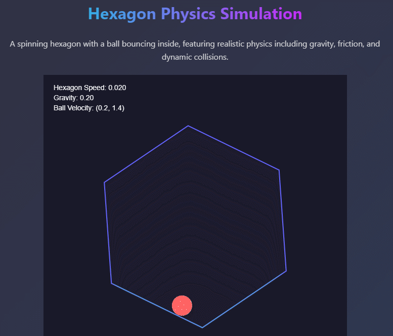 Create a p5.js of a spinning hexagon with a ball bouncing inside. Apply realistic physics including gravity and friction. Ensure the ball dynamically interacts with the rotating hexagonal walls, creating a realistic physics simulation.