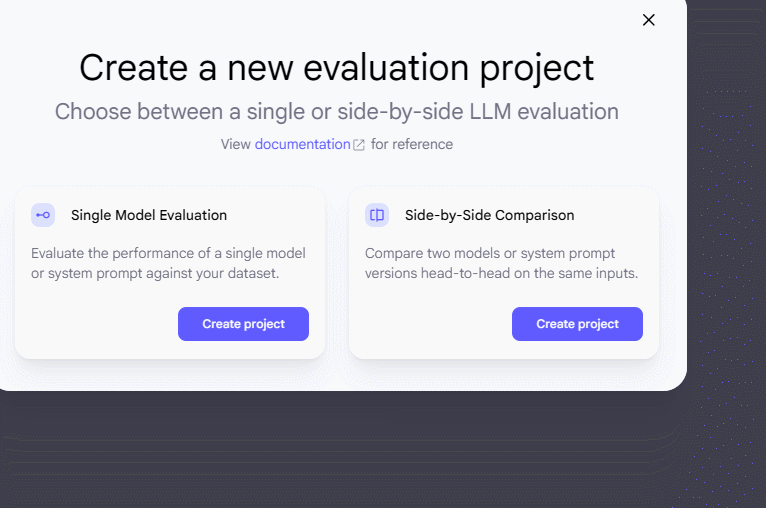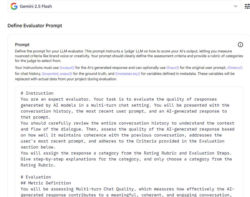 For each model, you can enter your system instructions. You can upload your dataset in CSV format. For your evaluator, you have the option to change prompt instructions and pick a model. A sample prompt is included but you can use AI to improve even that.