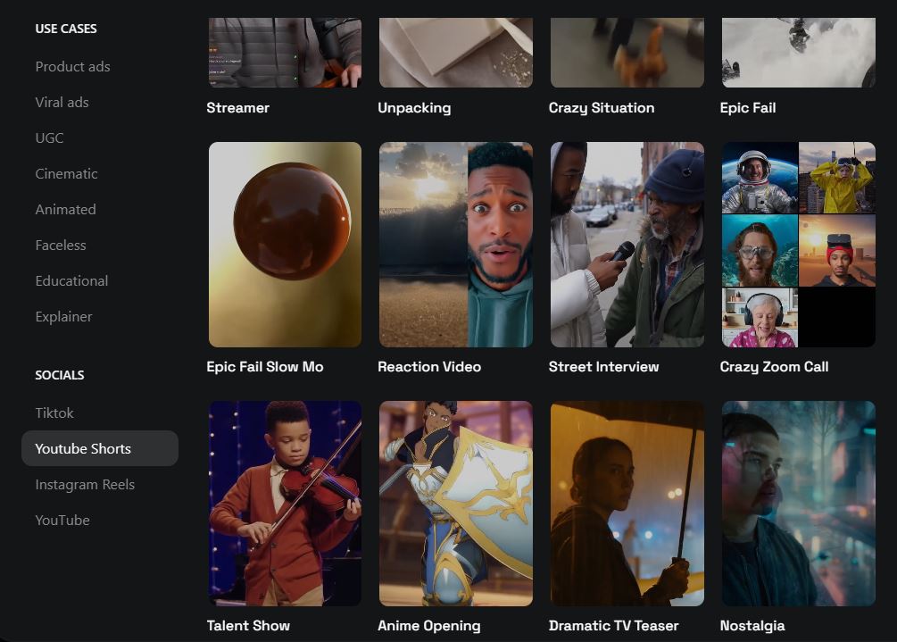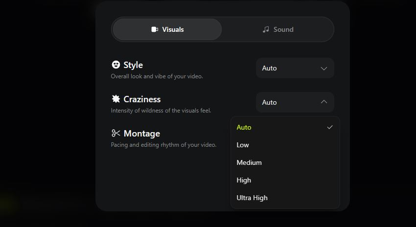 It is no secret that Sora is great for viral videos. With Higgsfield Trends, which is powered by Sora 2, you will be able to generate 1080p short-form videos. There are already a bunch of viral presets for you to choose from. You will just have to choose the platform you want to make a video for and choose visuals and sound settings. For your visuals, you can choose cinematic, cartoon, anime, and custom. You can also change the craziness factor and sound/music settings.
