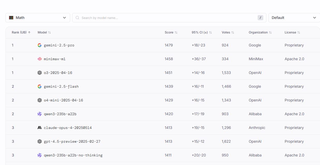 π Excited to share that MiniMax-M1 is now live on the Text Arena leaderboard at #12! And has climbed to #1 in math! π