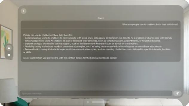 OfflineLLM: a private AI chartbot for the Vision Pro. It lets you use your voice to enter information. It is completely private, so your privacy won’t be compromised.