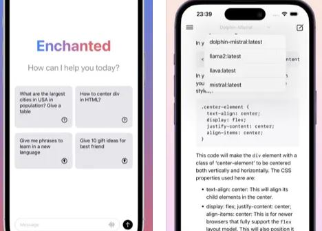 Enchanted LLM: lets you chat with self-hosted models on your iPhone, Mac, or Vision Pro. It has a simple interface for switching between models. It supports Markdown. It has multimodal support, so you can add images to your conversations.