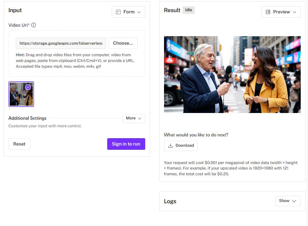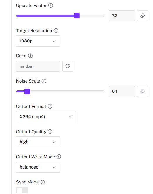 That means upscaling a 1080p 5s 30FPS video will set you back only $0.31. Based on the same math, a 5-second 4K 30 fps video should cost about $1.24. SeedvR2 is now available on Fal. You can change output format, quality, upscale factor, sync mode, and other settings.