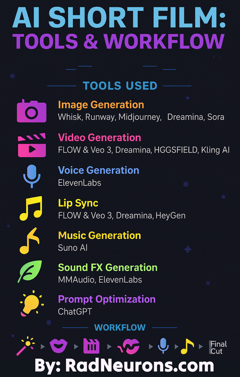 In this day and age, you don’t need to have a huge budget to bring your own short movies to life. Veo 3, Higgsfield, and Kling are just a few tools you have use for cinematic video. For image generation, you can use Whisk, Sora, Imagen 4, and Midjourney. We use HeyGen for most of our lipsync projects but many other tools can do a decent job. MMAudio, Suno, and ElevenLabs take care of sound effect and music generation. You can generate 100s of shots and enough videos for a short film for around $500. This visual serves as a cheat sheet to AI film product: