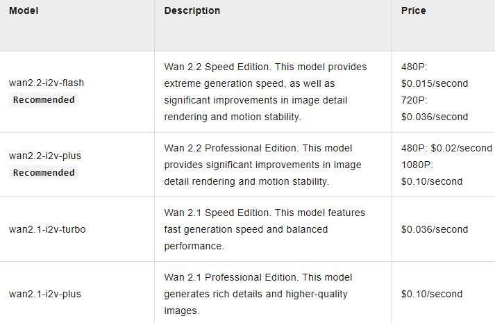 Wan2.2 is already very capable model. With Wan2.2-I2V-Flash, you can now generate videos faster and more cost effectively. Simply bring your images, and this model will maintain your style of images and generates natural motion. wan2.2-i2v-flash costs $0.036/second of 720o video. For wan2.2-i2v-plus, you can expect to spend $0.1 for every second of a 1080p video.